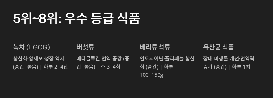 | 6 | 버섯 (표고·영지·송이 등) | 베타글루칸 면역 증강 (중간~높음) | 주 3~4회, 국·볶음 |