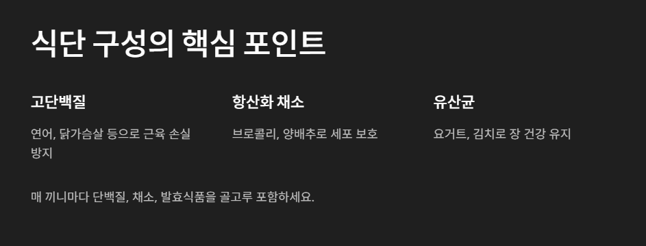 - 항산화·항염증 식품 위주 : 염증을 낮추고 세포 손상을 줄이는 음식 우선