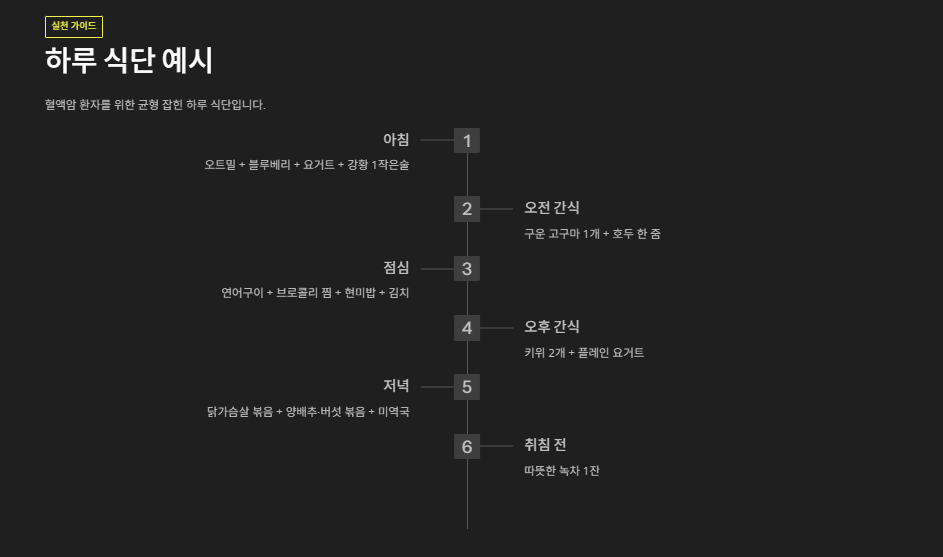 - 면역력 유지 + 감염 예방 : 백혈구·혈소판이 낮아지기 때문에 철저한 위생 조리 필수