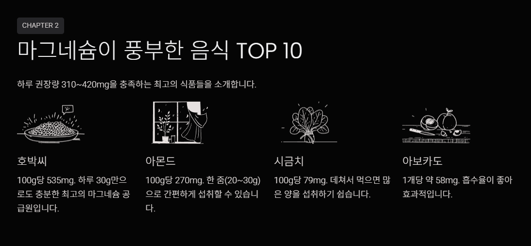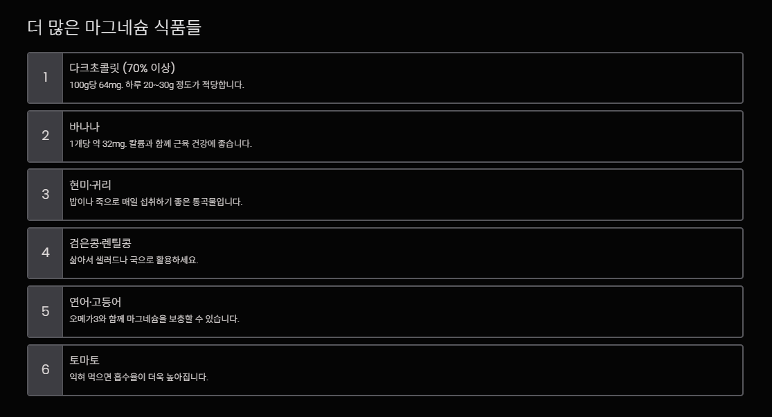 - 다크초콜릿 (70% 이상) – 100g당 64mg (20~30g 추천)