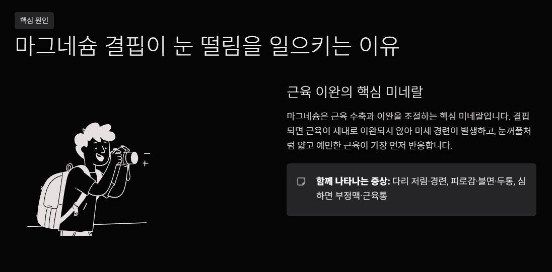 마그네슘은 근육 수축·이완을 조절하는 핵심 미네랄입니다. 결핍되면 근육이 제대로 이완되지 않아 미세 경련(떨림)이 발생하고, 눈꺼풀처럼 얇고 예민한 근육이 가장 먼저 반응합니다.