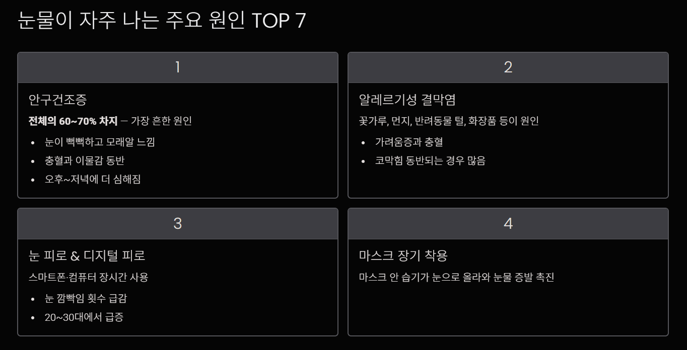 - 스마트폰·컴퓨터 장시간 사용 → 눈 깜빡임 횟수 급감 → 건조 → 반사 눈물