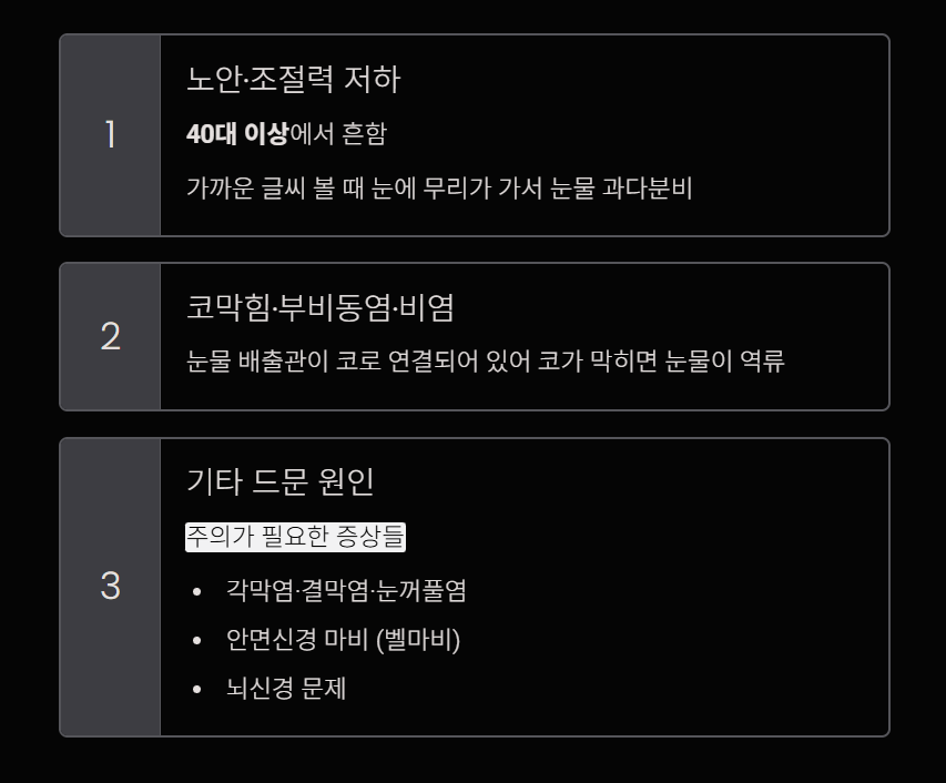 - 뇌신경 문제 (눈물 흘림 + 얼굴 마비 동반 시 즉시 병원)