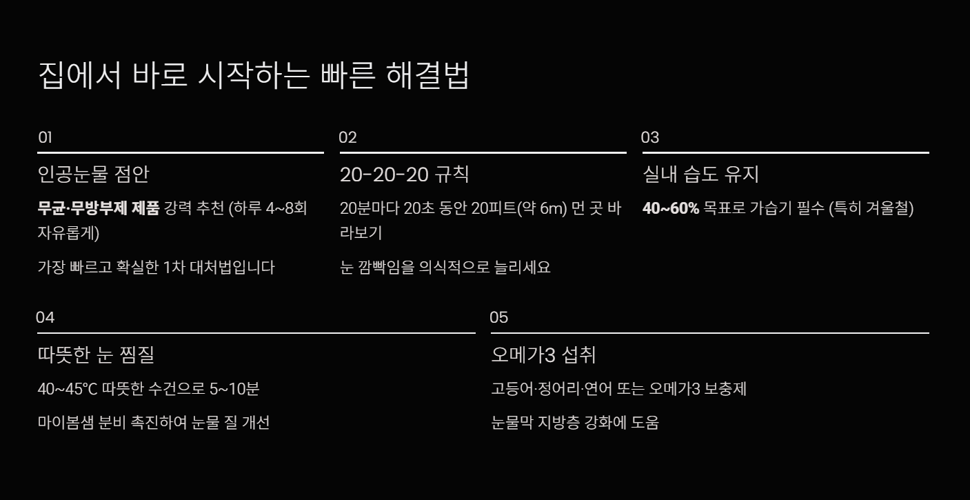 오늘부터 인공눈물 + 눈 깜빡임 + 습도 관리부터 시작해 보세요! 효과 보시면 댓글로 공유 부탁드려요~ 😊